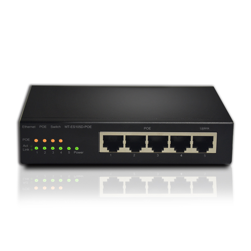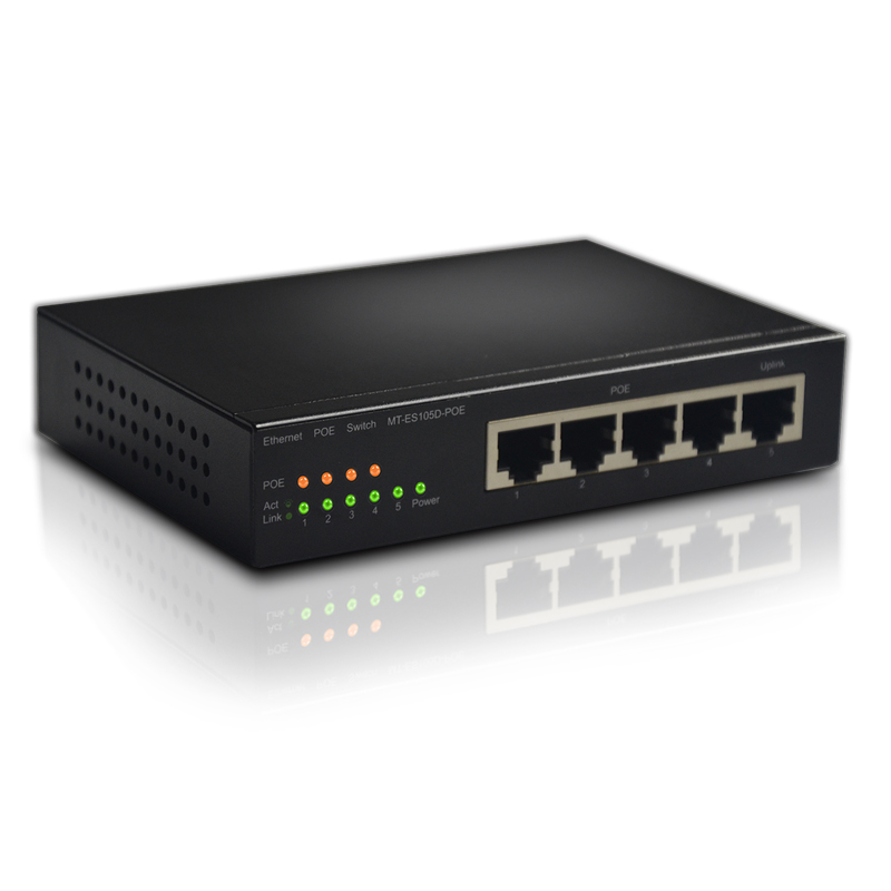 The MT-ES105D-POE Desktop Switch is a newly designed 5-port managed POE switch that provides an independent uplink port with 1 to 4 ports supporting the IEEE802.3AF / AT standard for monitoring engineering and network engineering, Can be wireless AP, IP cameras and other equipment power supply, plug and play, providing a low cost and high performance network solutions.